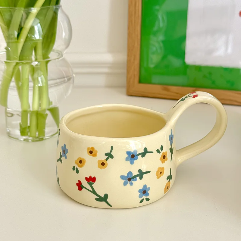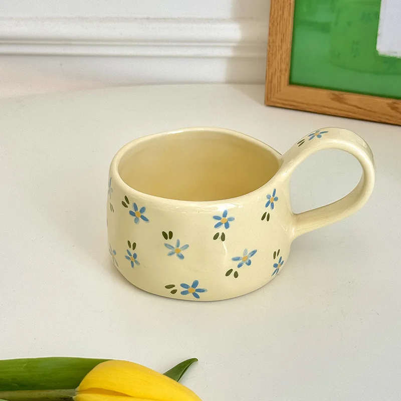 Cream Yellow Ceramic Mug with Cute Floral Design – Korean Style Coffee Cup