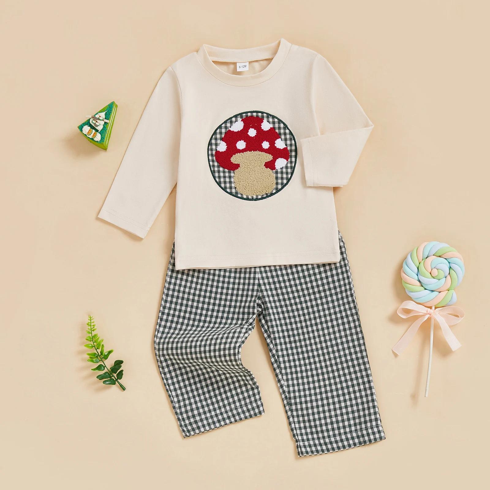 Make fall even more charming with this adorable 2-piece toddler outfit. Featuring a soft, long-sleeve crew neck T-shirt with a delightful embroidered mushroom design and paired with comfy plaid pants, this set is perfect for playful days and cozy moments. Whether your little one is crawling, walking, or toddling around the pumpkin patch, they’ll be wrapped in comfort and cuteness all season long.